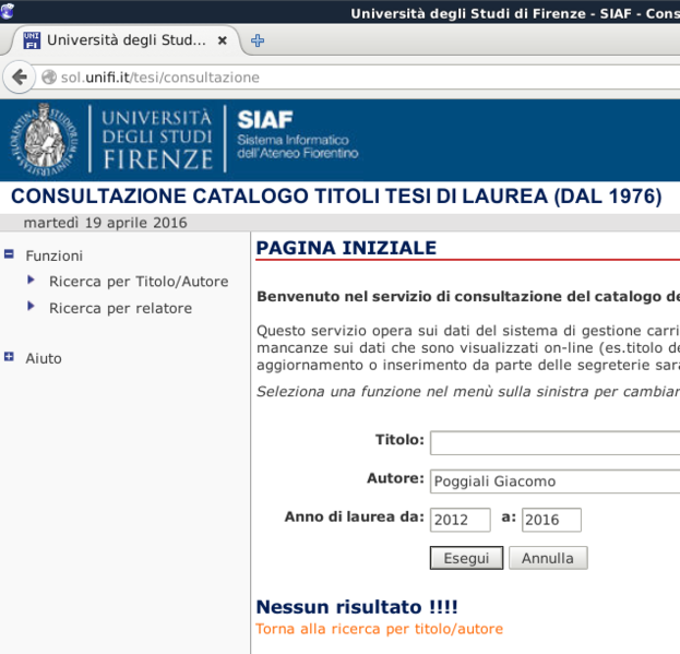 Screenshot dal sito dell'Università di Firenze, servizio ricerca tesi di laurea - 19 aprile 2016.