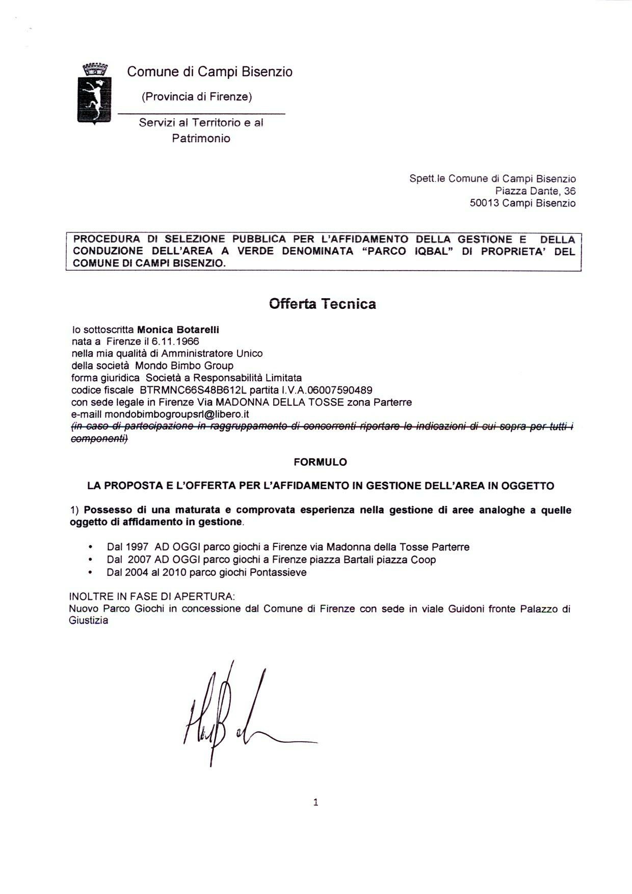 Procedura di selezione pubblica per l'affidamento della gestione e della conduzione dell'area verde denominata "Parco Iqbal" di proprietà del Comune di Campi Bisenzio - Offerta Tecnica - Società Mondo Bimbo Group.
