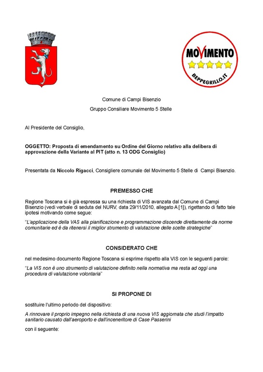 Consiglio comunale Campi Bisenzio - 16 dicembre 2014 - Emendamento M5S a Ordine del Giorno su PIT.