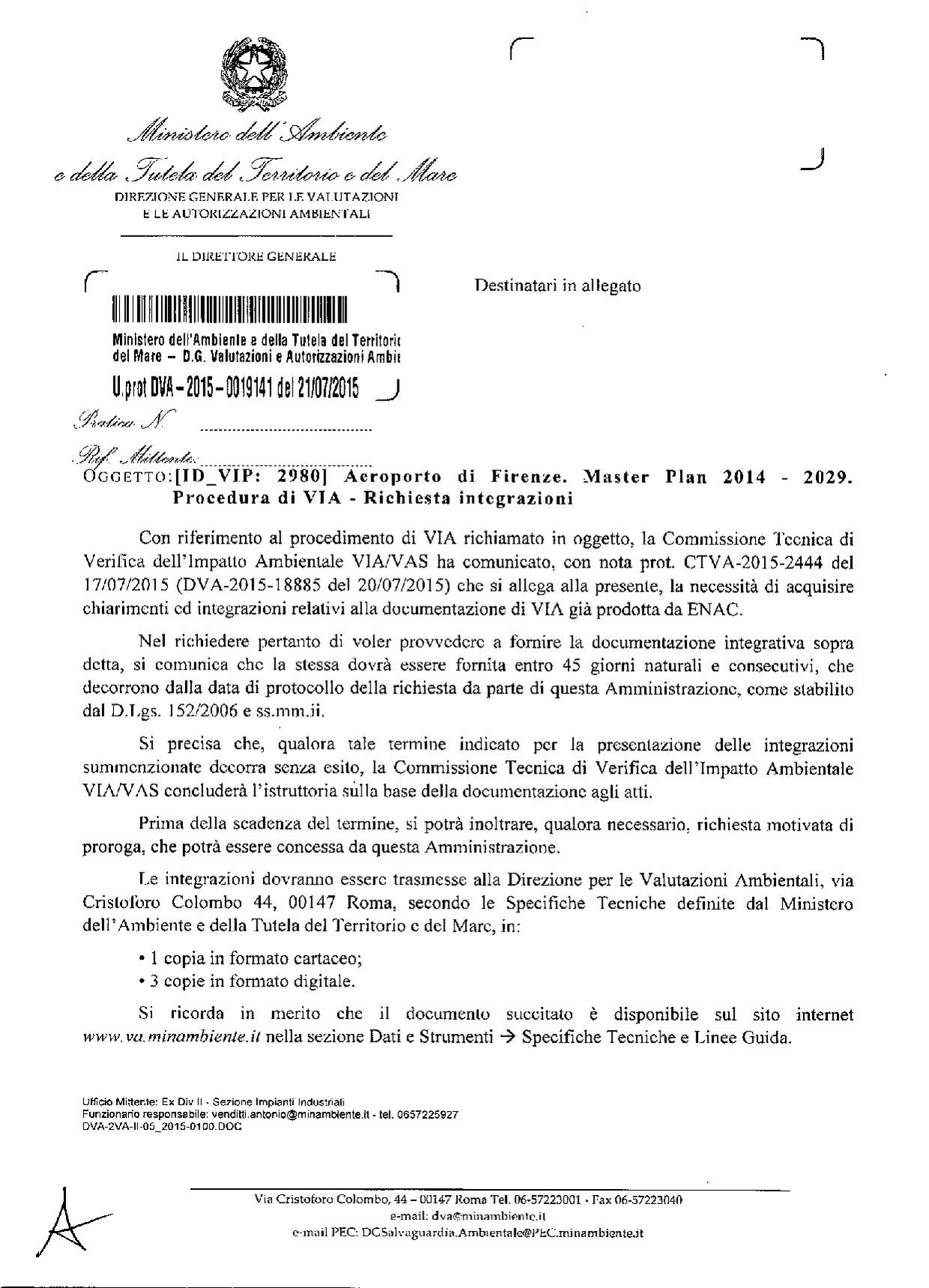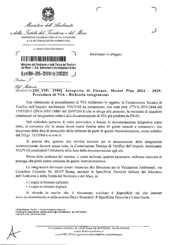 Ministero dell'Ambiente e della Tutala del Territorio e del Mare - Direzione generale per le valutazioni e le autorizzazioni ambientali - 21 luglio 2015 - Aeroporto di Firenze. Master Plan 2014 - 2029. Procedura di VIA - Richiesta integrazioni.