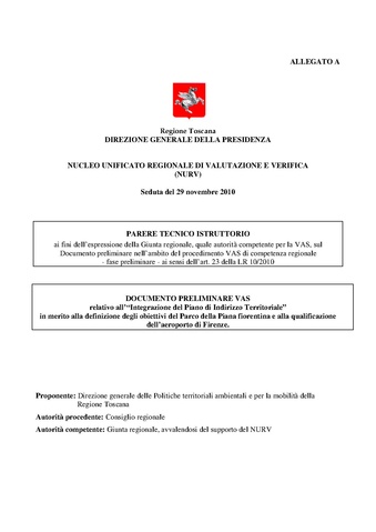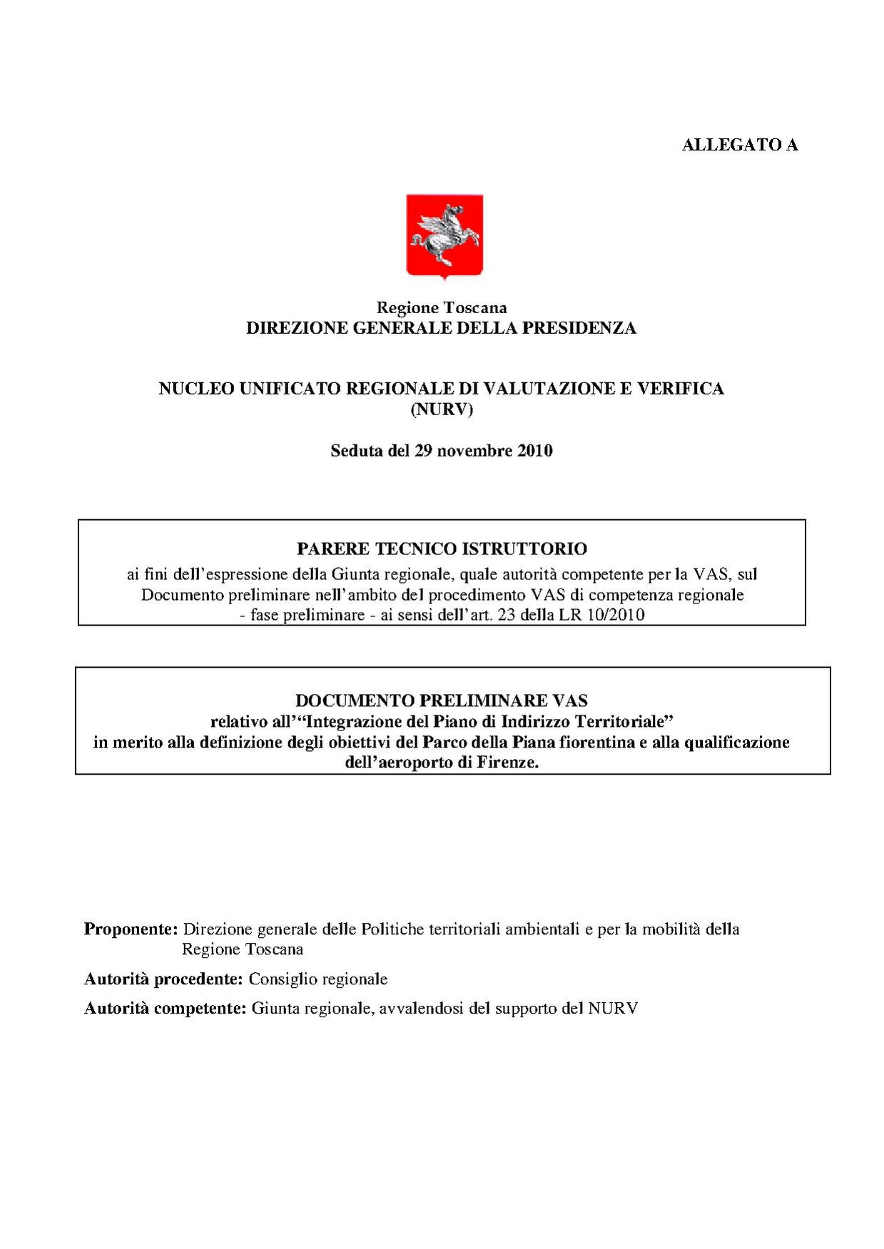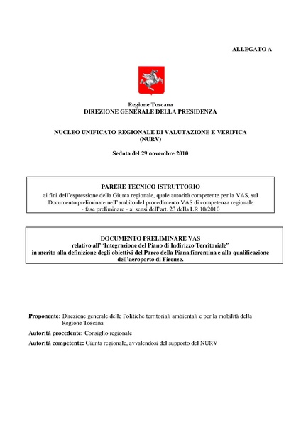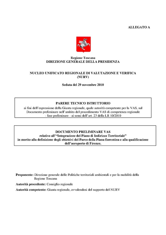 NUCLEO UNIFICATO REGIONALE DI VALUTAZIONE E VERIFICA (NURV) - Seduta del 29 novembre 2010 - PARERE TECNICO ISTRUTTORIO ai fini dell’espressione della Giunta regionale, quale autorità competente per la VAS, sul Documento preliminare nell’ambito del procedimento VAS di competenza regionale - fase preliminare - ai sensi dell’art. 23 della LR 10/2010