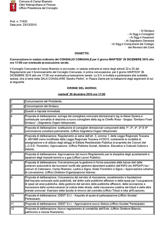 Comune di Campi Bisenzio - Convocazione in seduta ordinaria del CONSIGLIO COMUNALE per il giorno MARTEDI' 29 DICEMBRE 2015 alle ore 17:00 con eventuale prosecuzione serale.