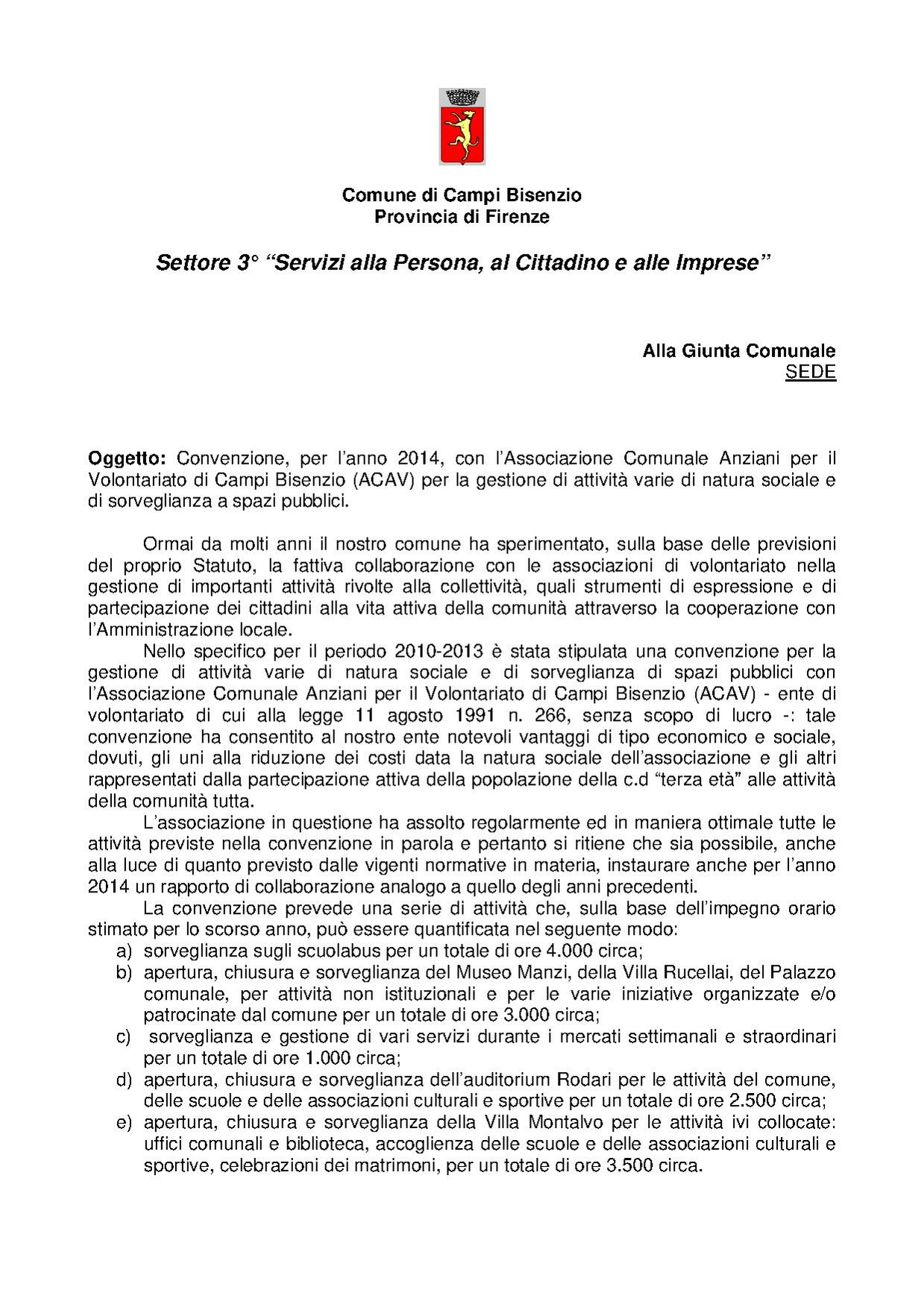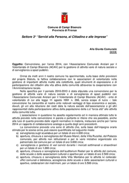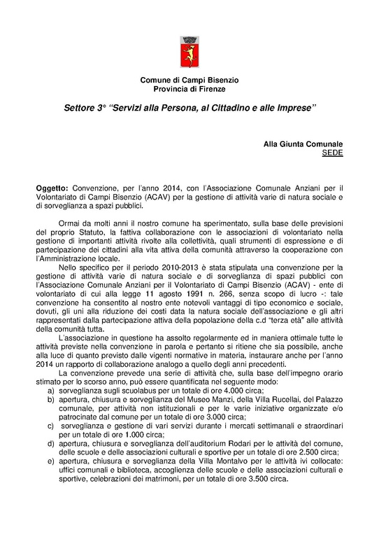 Delibera di Giunta n. 107 del 24 giugno 2014 - Approvazione schema di convenzione con l'Associazione Comunale Anziani per il Volontariato (ACAV - Onlus) di Campi Bisenzio per attività varie di natura sociale e di sorveglianza a spazi pubblici. - Allegato "Relazione"