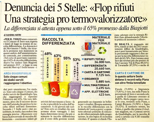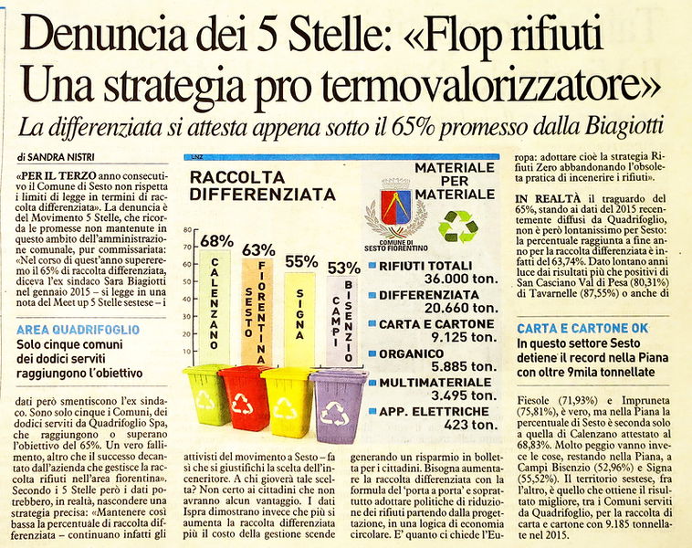 Denuncia dei 5 Stelle: "Flop rifiuti Una strategia pro termovalorizzatore" - La Nazione, 20 febbraio 2016