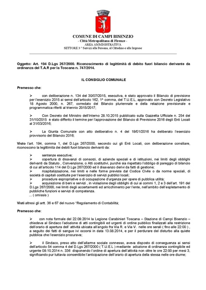 Art. 194 D.Lgs 267/2000. Riconoscimento di legittimità di debito fuori bilancio derivante da ordinanza del T.A.R per la Toscana n. 747/2014.
