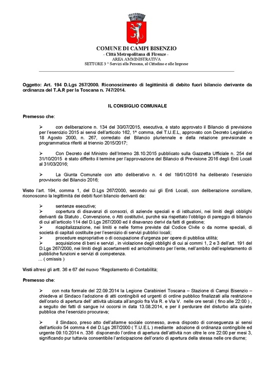 Versione del 25 mar 2016 alle 12:28 di Niccolo Rigacci (discussione | contributi) (Art. 194 D.Lgs 267/2000. Riconoscimento di legittimità di debito fuori bilancio derivante da ordinanza del T.A.R per la Toscana n. 747/2014. Consiglio Comunale del 23 marzo 2016 Categoria:Delibere Categoria:Sicurezza [[Categoria:Debiti fuori...)