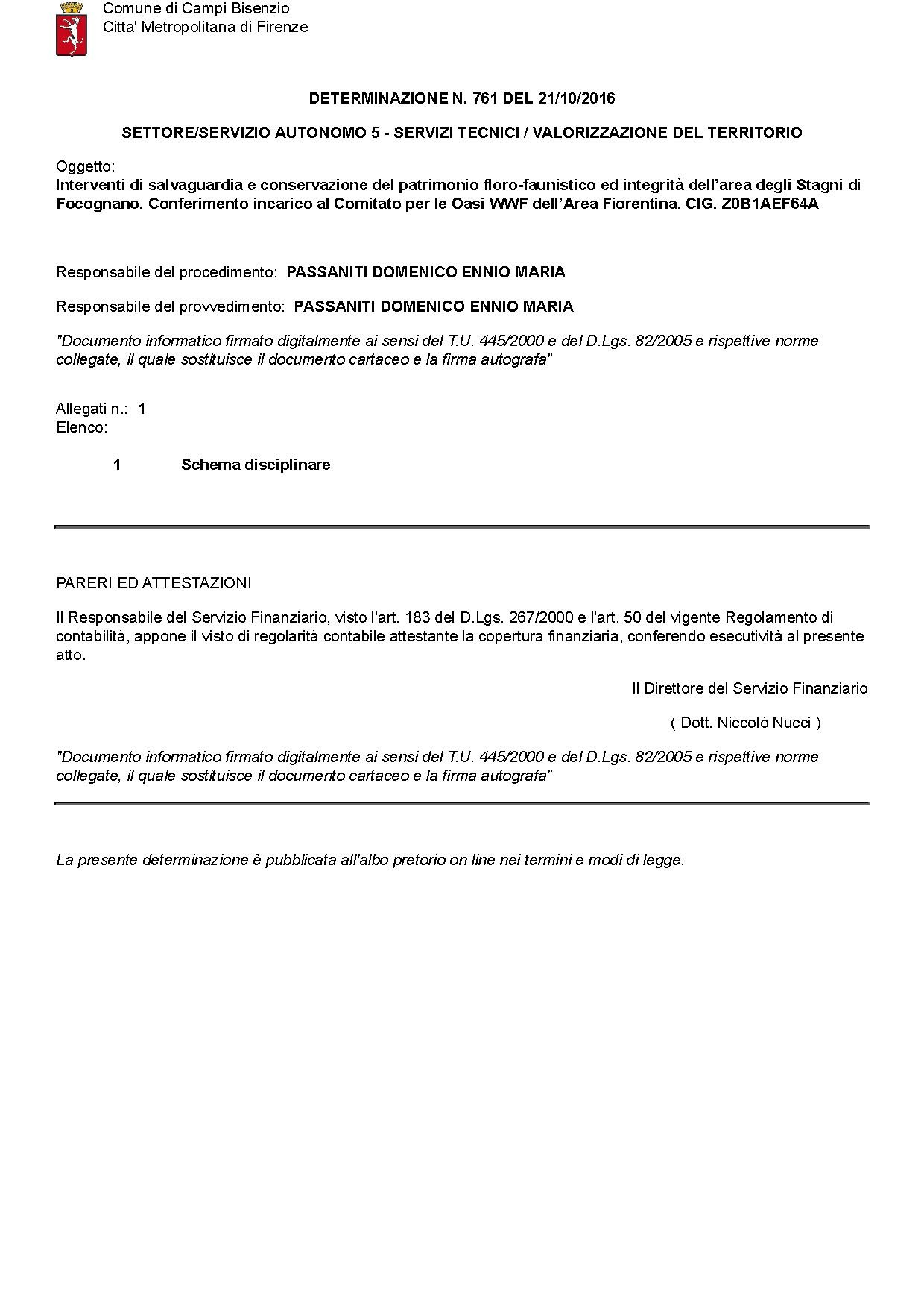 Comune di Campi Bisenzio - DETERMINAZIONE N. 761 DEL 2016-10-21 - Interventi di salvaguardia e conservazione del patrimonio floro-faunistico ed integrita dell?area degli Stagni di Focognano. Conferimento incarico al Comitato per le Oasi WWF dell?Area Fiorentina. CIG. Z0B1AEF64A