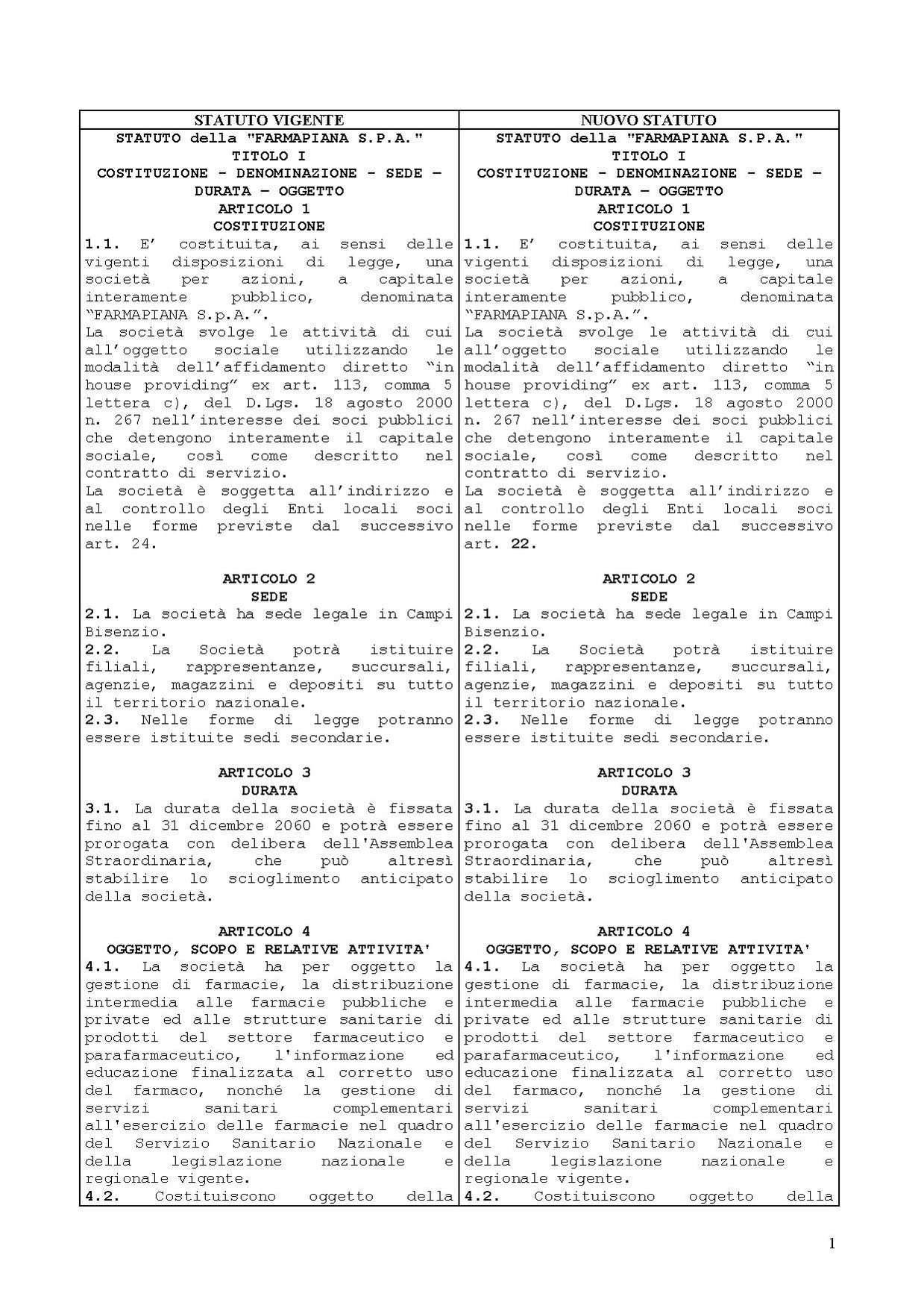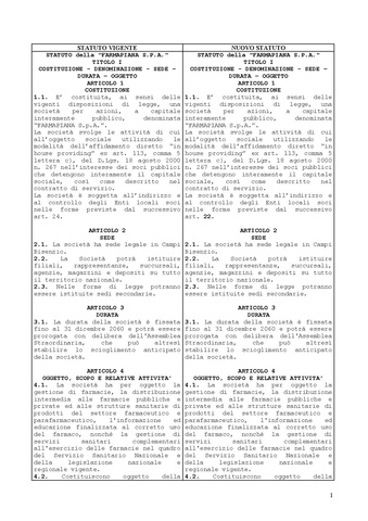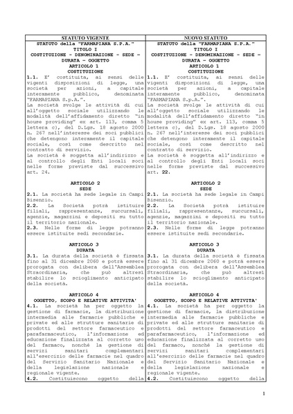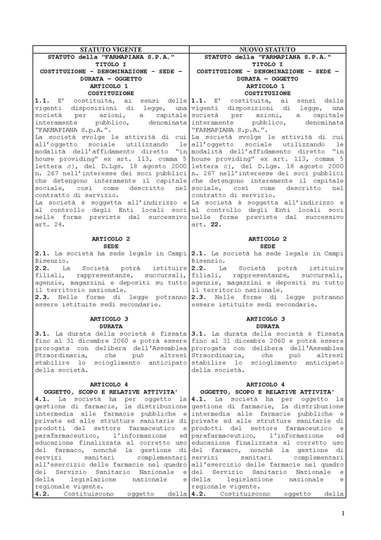 Delibera del Consiglio Comunale di Campi Bisenzio: "Farmapiana S.P.A. - Modifiche allo Statuto", raffronto tra vecchio e nuovo statuto.