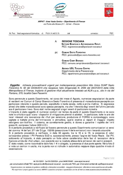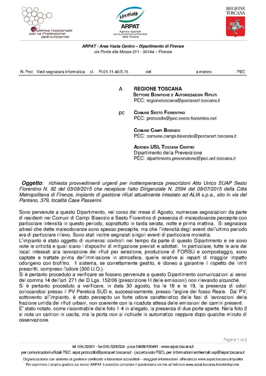 Oggetto: richiesta provvedimenti urgenti per inottemperanza prescrizioni Atto Unico SUAP Sesto Fiorentino N. 92 del 03/08/2015 che recepisce l’atto Dirigenziale N. 2594 del 08/07/2015 della Città Metropolitana di Firenze, impianto di gestione rifiuti attualmente intestato ad ALIA s.p.a., sito in via del Pantano, 379, località Case Passerini - 1 settembre 2017 - Vedere documento Allegato fotografico.