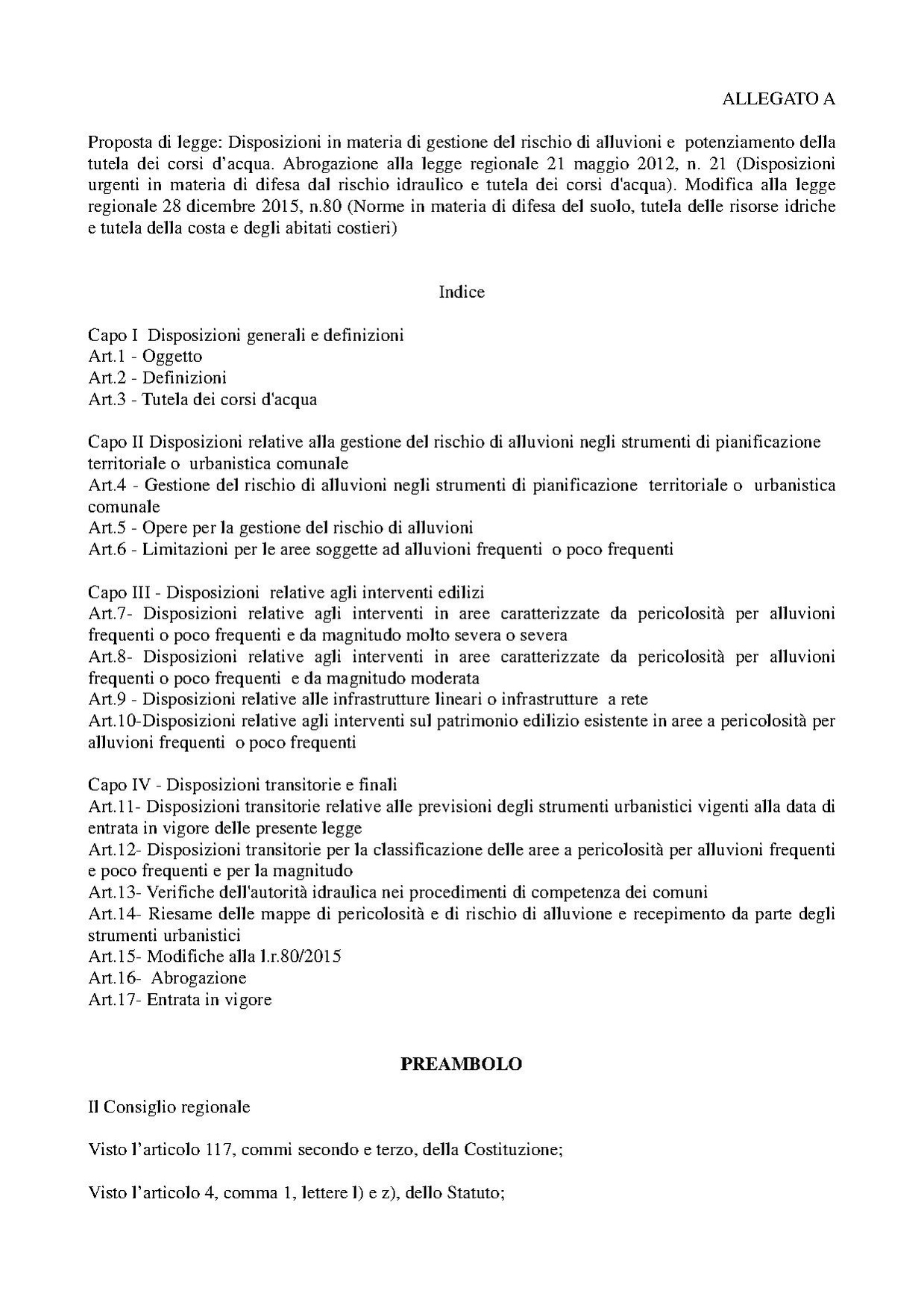 Regione Toscana - Proposta di legge: Disposizioni in materia di gestione del rischio di alluvioni e potenziamento della tutela dei corsi d’acqua. Abrogazione alla legge regionale 21 maggio 2012, n. 21 (Disposizioni urgenti in materia di difesa dal rischio idraulico e tutela dei corsi d'acqua). Modifica alla legge regionale 28 dicembre 2015, n.80 (Norme in materia di difesa del suolo, tutela delle risorse idriche e tutela della costa e degli abitati costieri)