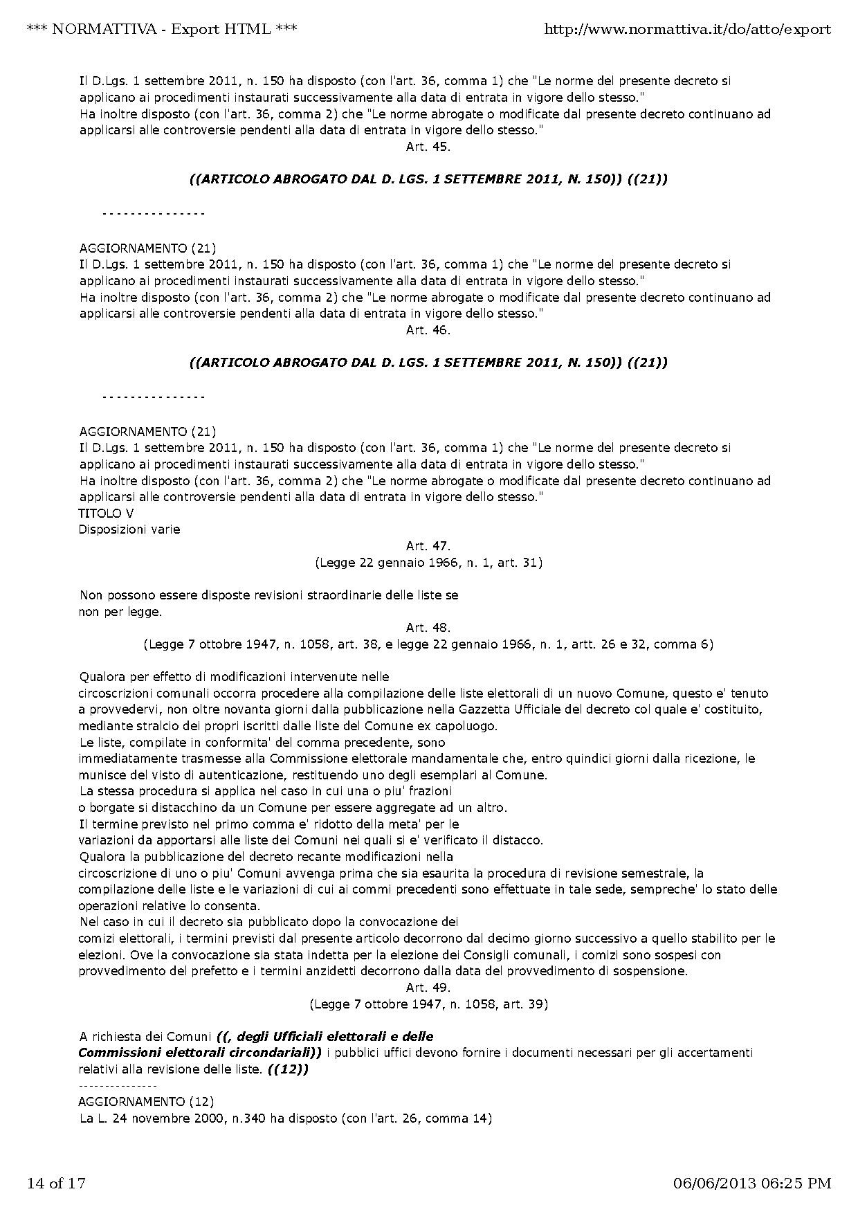 Decreto Presidente della Repubblica 20 marzo 1967, n. 223 Testo unico delle leggi per la disciplina dell'elettorato attivo e per la tenuta e la revisione delle liste elettorali - http://www.normattiva.it/uri-res/N2Ls?urn:nir:stato:legge:1967-03-20;223