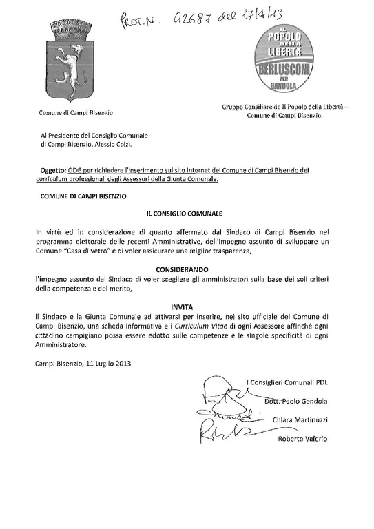 DELIBERAZIONE DEL CONSIGLIO COMUNALE N. 112 DEL 25/07/2013 - Ordine del Giorno per richiedere l'inserimento sul sito Internet del Comune di Campi Bisenzio dei curriculum professionali degli Assessori della Giunta Comunale, presentato dal gruppo consiliare "P.D.L." (prot.nr.42687 del 17.07.2013).