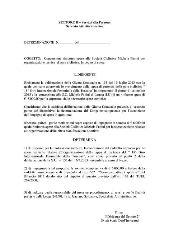 DETERMINAZIONE N. 97 DEL 26/08/2013 Settore: Servizi alla Persona - Concessione rimborso spese alla Società Cclistica Michela Fanini per organizzazione tecnica di gara ciclistica. Impegno di spesa.