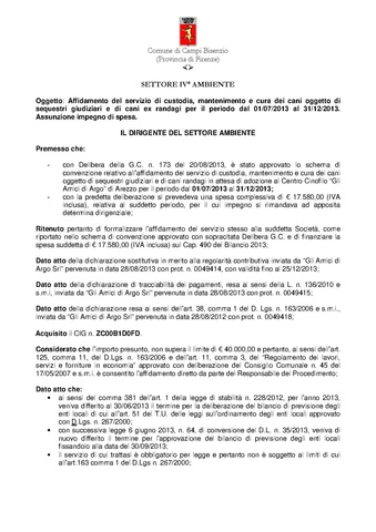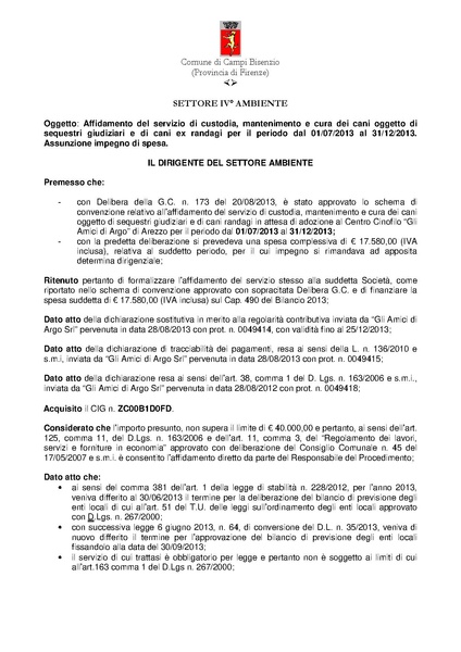 COMUNE DI CAMPI BISENZIO - DETERMINAZIONE N. 27 DEL 16/09/2013 - Settore: Tutela dell'Ambiente - Verde e Patrimonio Artistico e Architettonico - AFFIDAMENTO DEL SERVIZIO DI CUSTODIA, MANTENIMENTO E CURA DEI CANI OGGETTO DI SEQUESTRI E DI CANI EX RANDAGI PER IL PERIODO DAL 01/07/2013 AL 31/12/2013. ASSUNZIONE IMPEGNO DI SPESA.