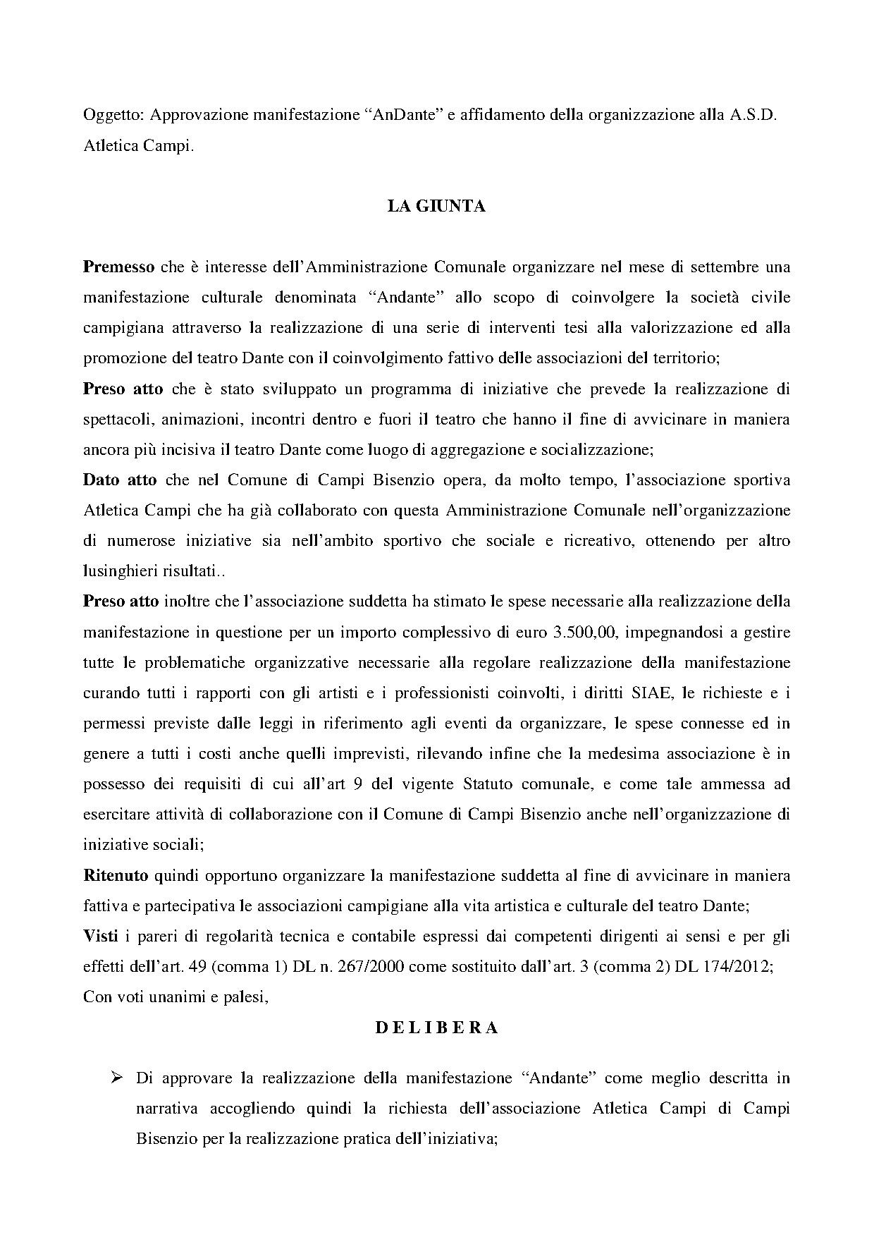 DELIBERAZIONE DELLA GIUNTA COMUNALE N. 196 DEL 17/09/2013 - Approvazione manifestazione "AnDante" e affidamento della organizzazione alla A.S.D. Atletica Campi.
