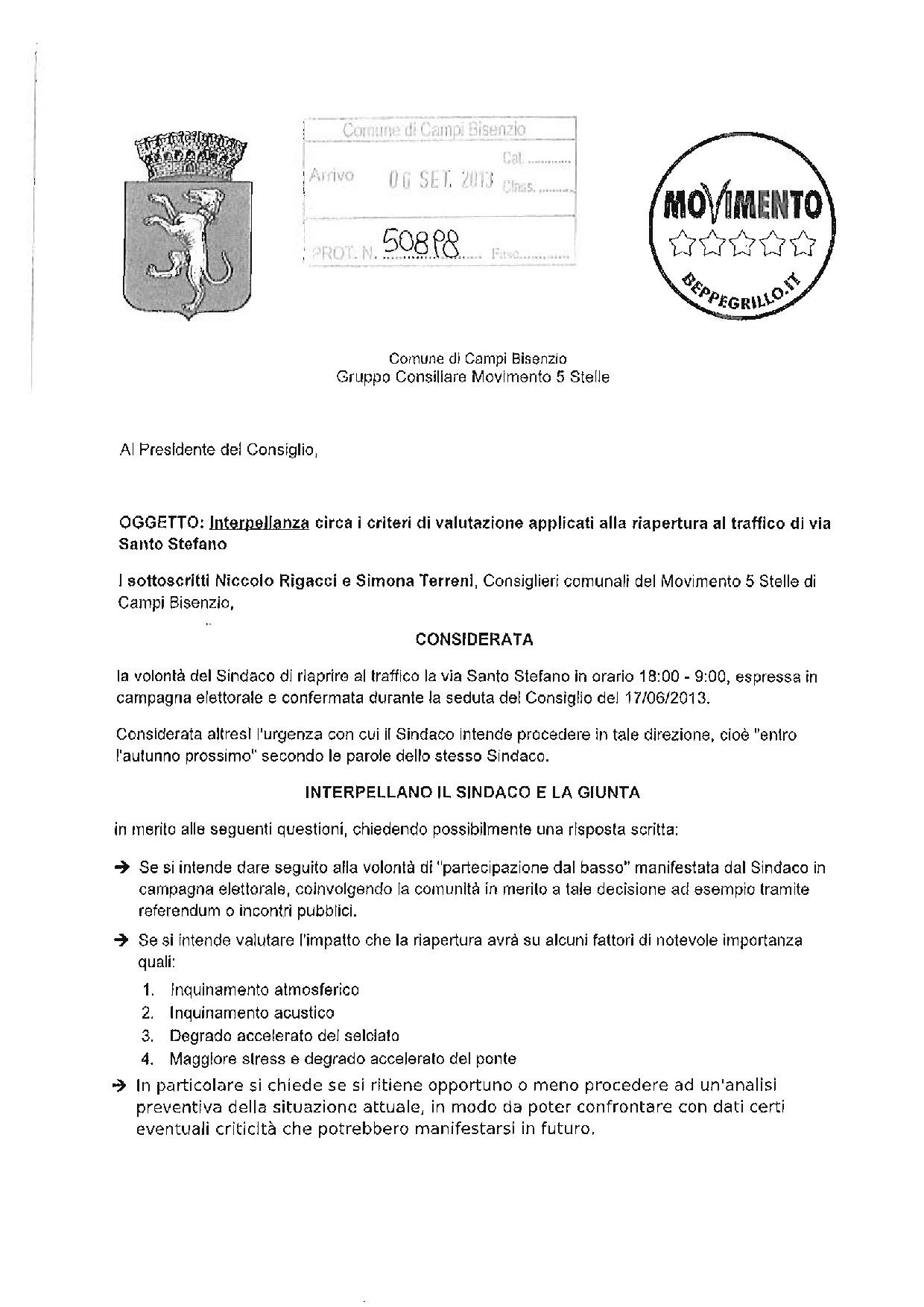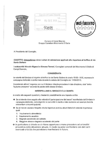 DELIBERAZIONE DEL CONSIGLIO COMUNALE N. 118 DEL 18/09/2013 - Interpellanza circa i criteri di valutazione applicati alla riapertura al traffico di via Santo Stefano, presentata dal gruppo consiliare "Movimento 5 Stelle" (prot.nr.50898 del 6.09.2013).