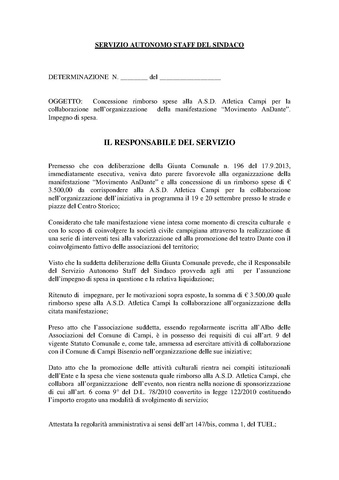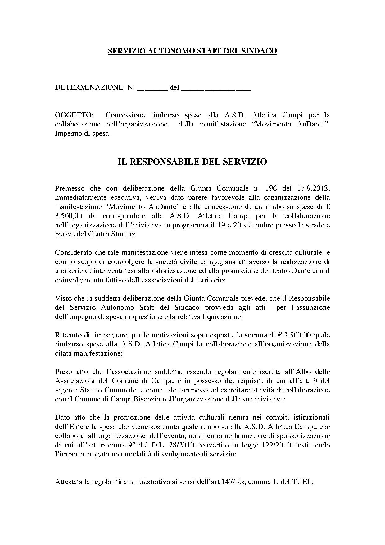 DETERMINAZIONE N. 28 DEL 18/09/2013 - Settore: Staff del Sindaco - Comunicazione e Partecipazione - Concessione rimborso spese alla A.S.D. Atletica Campi per la collaborazione nell'organizzazione della manifestazione "Movimento AnDante". Impegno di spesa