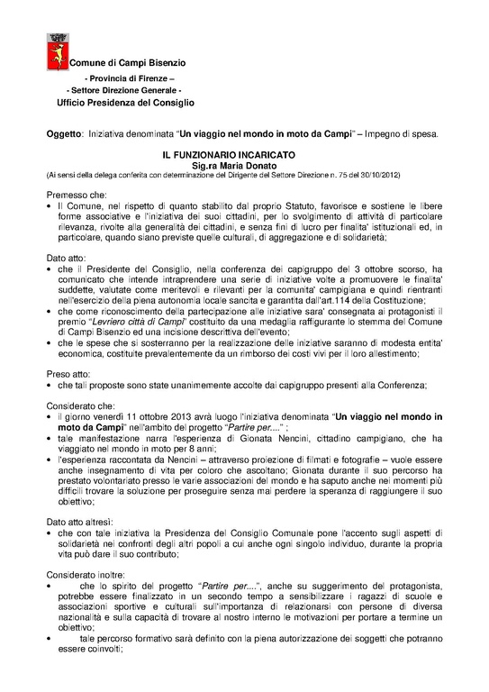 COMUNE DI CAMPI BISENZIO - DETERMINAZIONE N. 83 DEL 08/10/2013 - Settore: Direzione - Iniziativa denominata "Un viaggio nel mondo in moto da Campi" Impegno di spesa.