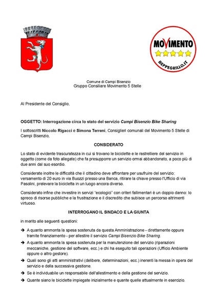 DELIBERAZIONE DEL CONSIGLIO COMUNALE N. 135 DEL 24/10/2013 - Interrogazione circa lo stato del servizio Campi Bisenzio Bike Sharing, presentata dal gruppo consiliare "Movimento 5 Stelle" (prot.nr.58196 del 10.10.2013).