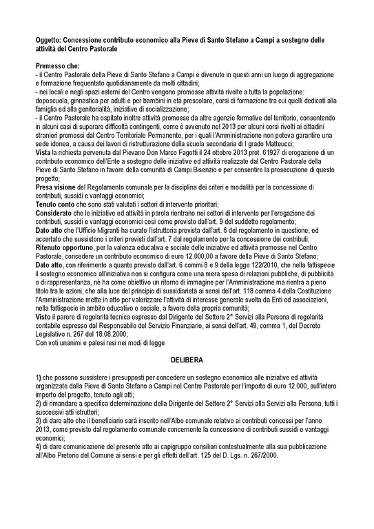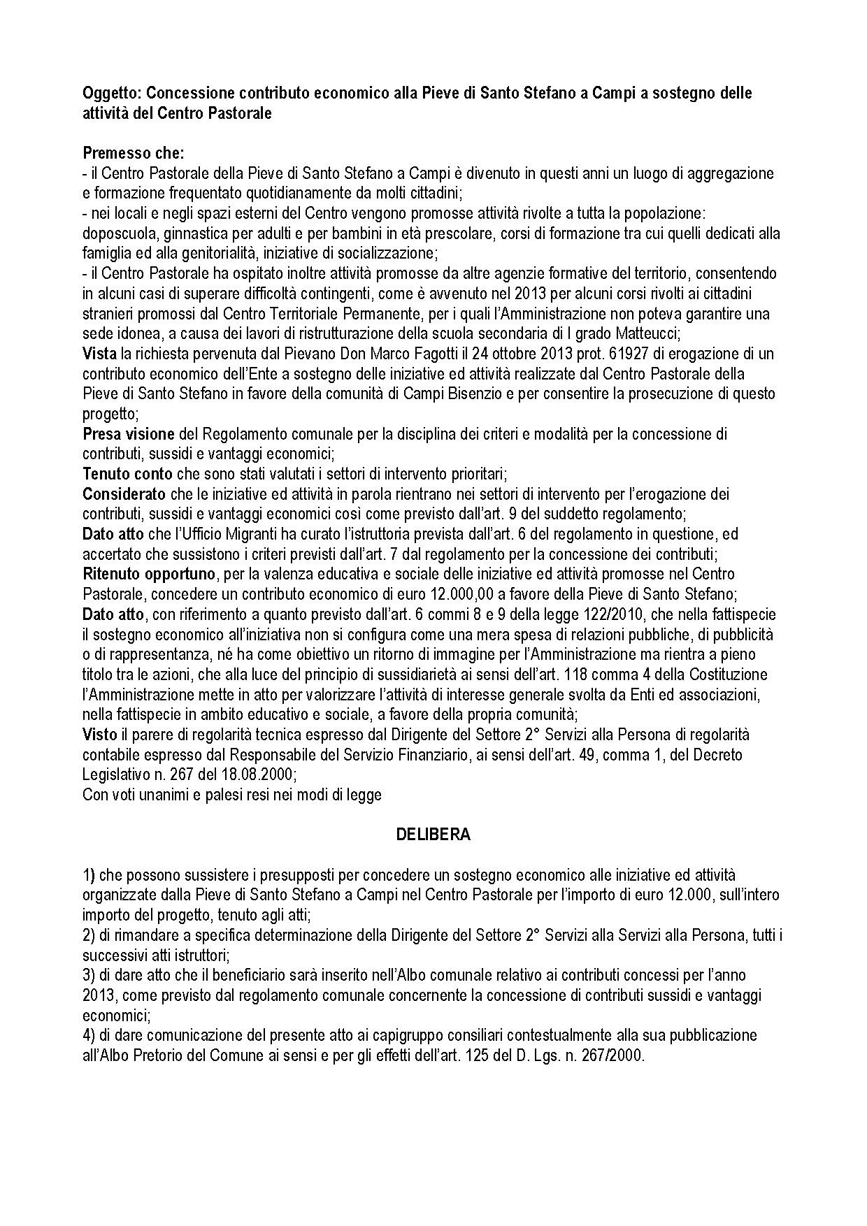 DELIBERAZIONE DELLA GIUNTA COMUNALE N. 273 DEL 10/12/2013 - Concessione contributo economico alla Pieve di Santo Stefano a sostegno delle attività del Centro Pastorale.