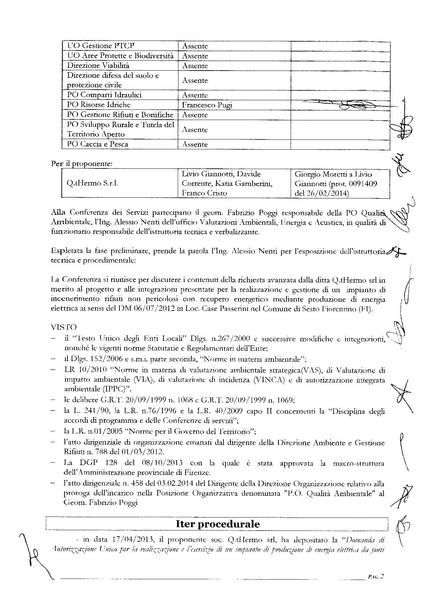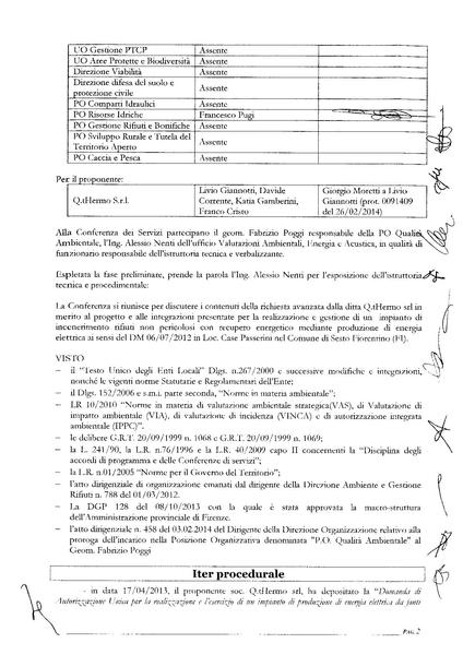 Provincia di Firenze - Conferenza dei Servizi - Seduta del 28/02/2014 - Seconda seduta - Procedura di Valutazione di Impatto Ambientale (VIA) ai sensi dell'art. 52 e seg. della LR 10/2010 per il progetto per la realizzazione e gestione di un impianto di incenerimento rifiuti non pericolosi con recupero energetico mediante produzione di energia elettrica ai sensi del DM 06/07/2012. Loc. Case Passerini nel Comune di Sesto Fiorentino (FI). Proponente: Q.tHermo s.r.l.