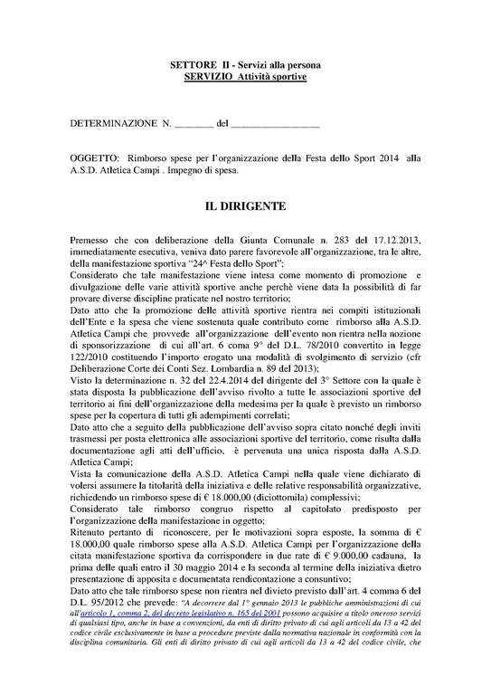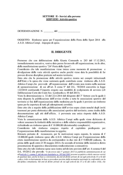 Comune di Campi Bisenzio - DETERMINAZIONE N. 47 DEL 2014-05-22 - Rimborso spese per l’organizzazione della Festa dello Sport 2014 alla A.S.D. Atletica Campi. Impegno di spesa