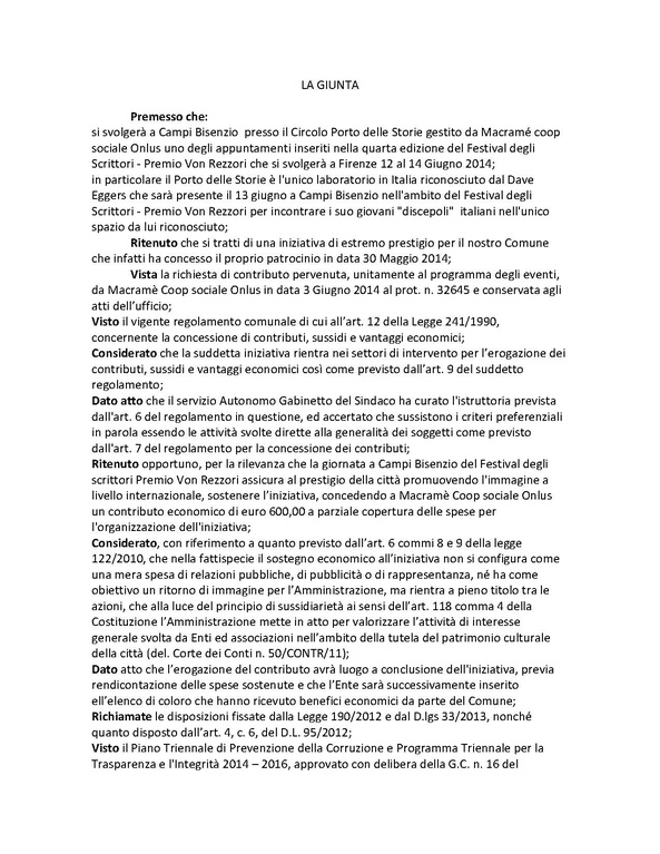 Comune di Campi Bisenzio - DELIBERAZIONE N. 88 DEL 2014-06-10 - "Quarta edizione Festival degli Scrittori città di Firenze, organizzazione iniziativa Porto delle Storie. Concessione contributo."