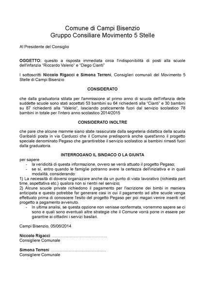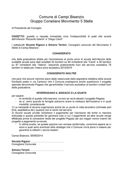 Comune di Campi Bisenzio - DELIBERAZIONE N. 73 DEL 2014-06-12 - Quesiti a risposta immediata.