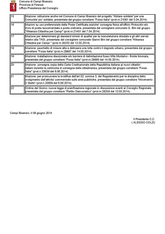 Comune di Campi Bisenzio - Convocazione in seduta ordinaria del CONSIGLIO COMUNALE per il giorno GIOVEDI' 12 GIUGNO 2014 alle ore 17:00
