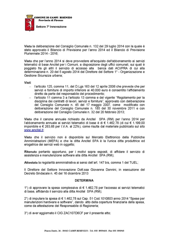 Comune di Campi Bisenzio - DETERMINAZIONE N. 17 DEL 2014-08-19 - Adesione ai servizi telematici di base Ancitel per i Comuni – anno 2014. Impegno di spesa. CIG ZAC107D6CF.