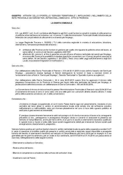Comune di Campi Bisenzio - DELIBERAZIONE N. 157 DEL 2014-09-19 - ATTIVITA' DELLO SPORTELLO “SERVIZIO TERRITORIALE” ( INFOLAVORO ) NELL'AMBITO DELLA RETE PROVICIALE DEI SERVIZI PER L'IMPIEGO NELL'ANNO 2014 - ATTO DI PROROGA.