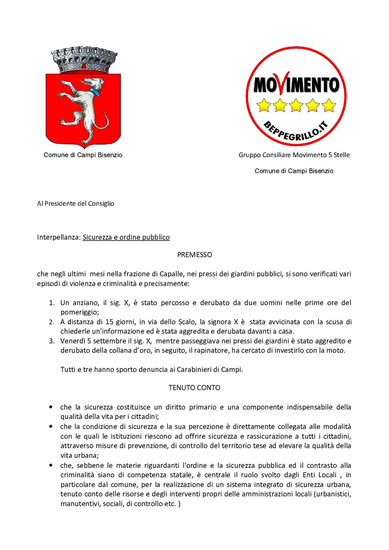 Comune di Campi Bisenzio - DELIBERAZIONE N. 135 DEL 2014-09-23 - Interpellanza: sicurezza e ordine pubblico, presentata dal gruppo consiliare "Movimento 5 Stelle" (prot.nr.50943 del 16.09.2014).