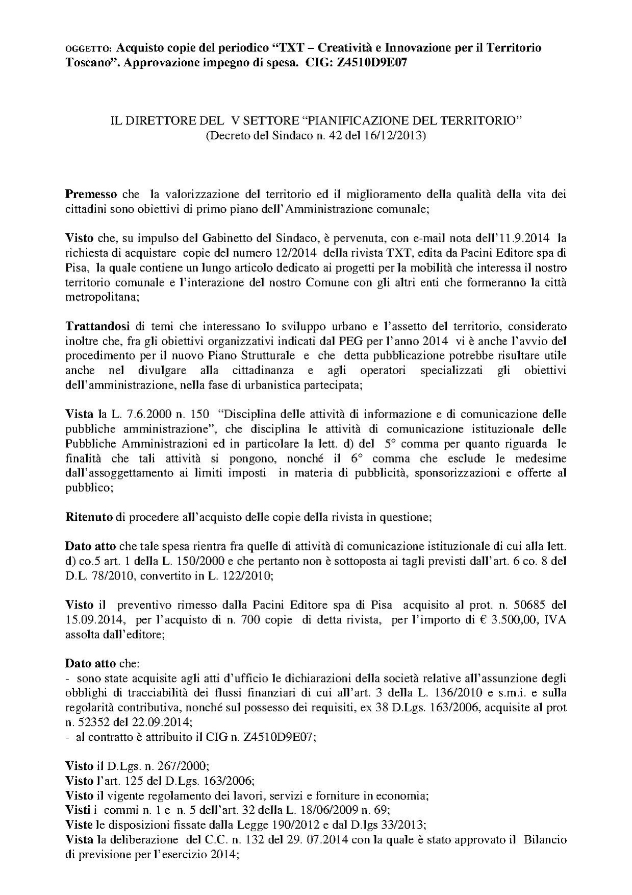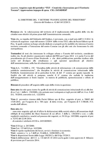 Comune di Campi Bisenzio - DETERMINAZIONE N. 45 DEL 2014-09-25 - Acquisto copie del periodico “TXT – Creatività e Innovazione per il Territorio Toscano”. Approvazione impegno di spesa. CIG: Z4510D9E07