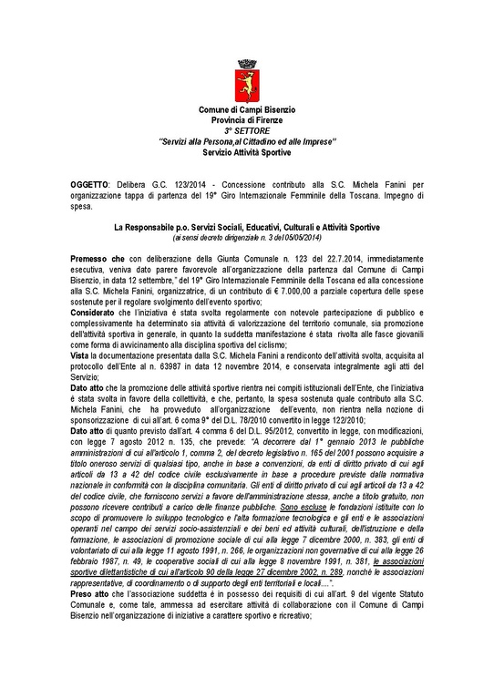 Comune di Campi Bisenzio - DETERMINAZIONE N. 119 DEL 2014-11-17 - Delibera G.C. 123/2014 - Concessione contributo alla S.C. Michela Fanini per organizzazione tappa di partenza del 19° Giro Internazionale Femminile della Toscana. Impegno di spesa.