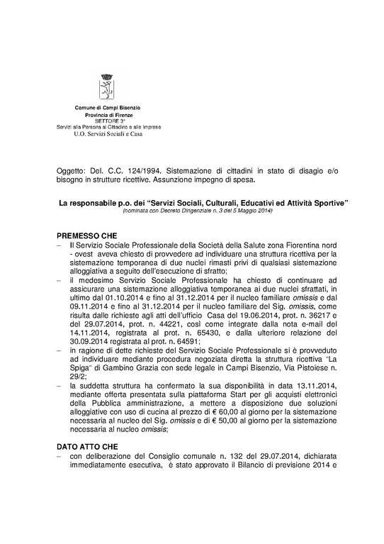 Comune di Campi Bisenzio - DETERMINAZIONE N. 122 DEL 2014-11-20 - Oggetto: Del. C.C. 124/1994. Sistemazione di cittadini in stato di disagio e/o bisogno in strutture ricettive. Assunzione impegno di spesa.