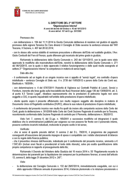 Comune di Campi Bisenzio - DETERMINAZIONE N. 112 DEL 2014-11-26 - impegno di spesa per incarico legale ad Avv. Giulio Conticelli per ricorso in appello De Caro al Consiglio di Stato avverso la sentenza TAR n. 407/2014