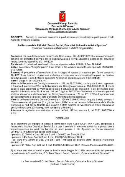 Comune di Campi Bisenzio - DETERMINAZIONE N. 144 DEL 2014-12-05 - Servizio di refezione scolastica e produzione e somministrazione pasti presso il nido Agnoletti. Impegno di spesa.