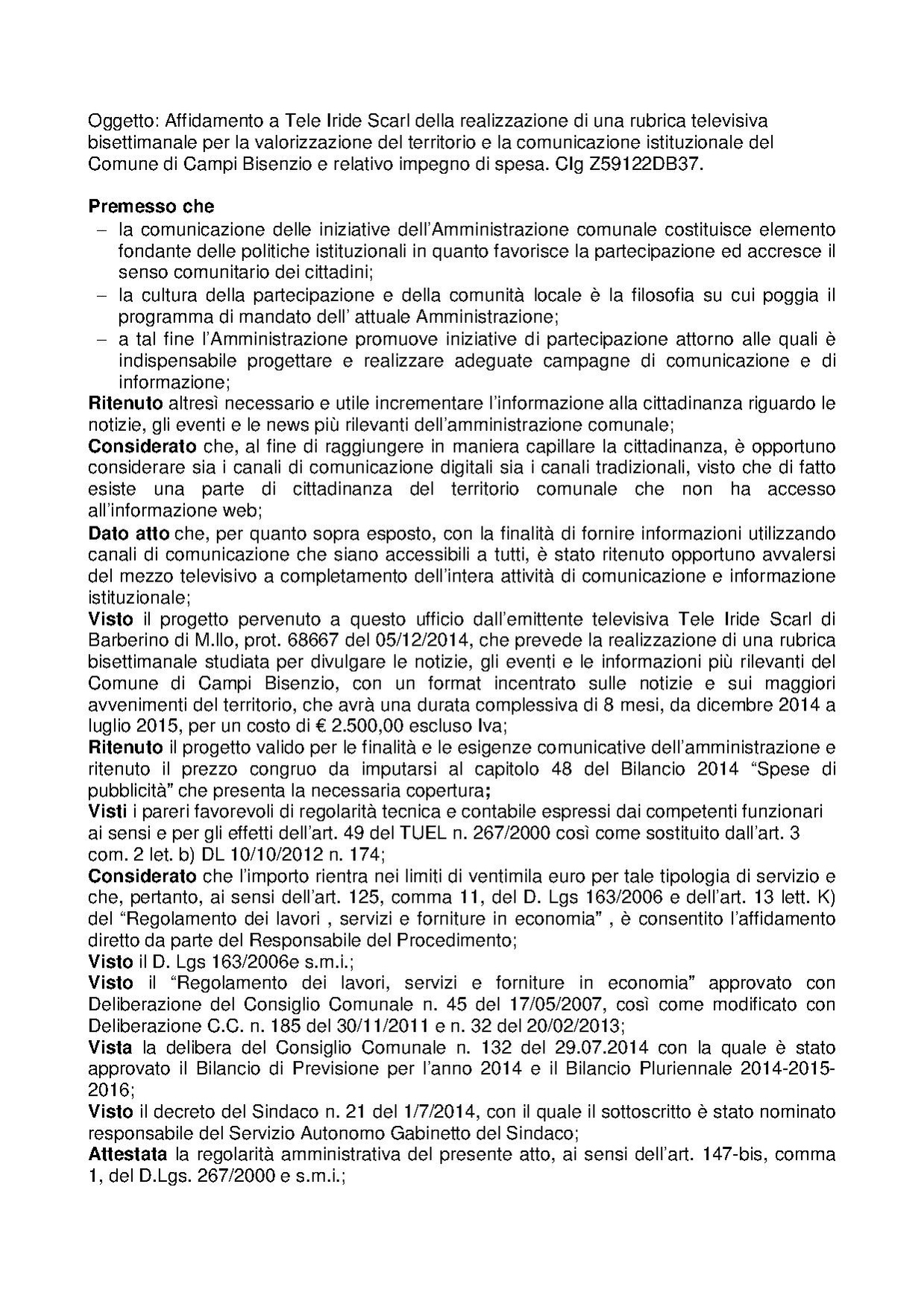 Comune di Campi Bisenzio - DETERMINAZIONE N. 15 DEL 2014-12-10 - Affidamento a Tele Iride Scarl della realizzazione di una rubrica televisiva bisettimanale per la valorizzazione del territorio e la comunicazione istituzionale del Comune di Campi Bisenzio e relativo impegno di spesa. CIg Z59122DB37.