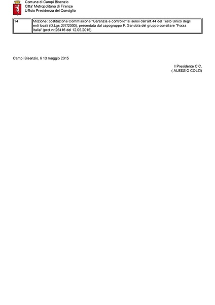 Comune di Campi Bisenzio - Convocazione in seduta ordinaria del CONSIGLIO COMUNALE per il giorno MARTEDI' 19 MAGGIO 2015 alle ore 17:00