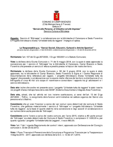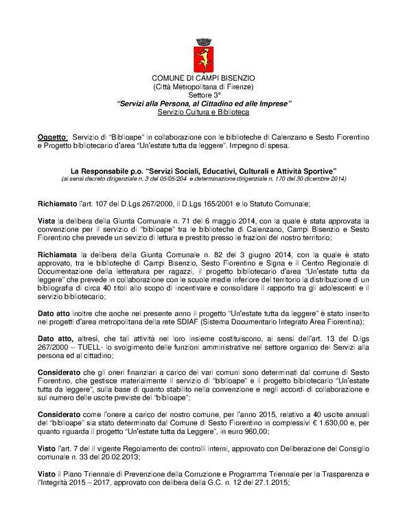 Comune di Campi Bisenzio - DETERMINAZIONE N. 326 DEL 2015-06-29 - Servizio di Biblioape in collaborazione con le biblioteche di Calenzano e Sesto Fiorentino e Progetto bibliotecario d?area ?Un?estate tutta da leggere? Impegno di spesa.