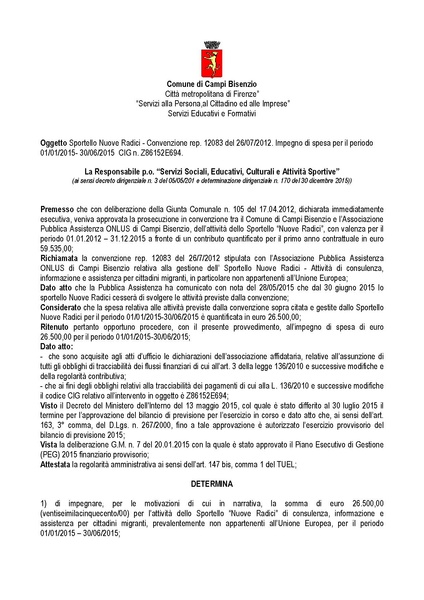 Comune di Campi Bisenzio - DETERMINAZIONE N. 329 DEL 2015-06-30 - Sportello Nuove Radici - Convenzione rep. 12083 del 26/07/2012. Impegno di spesa per il periodo 01/01/2015- 30/06/2015 CIG n. Z86152E694