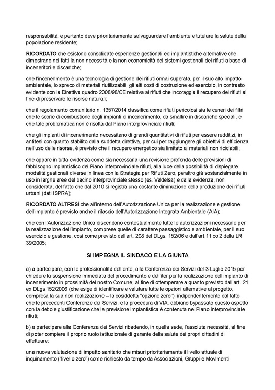 Consiglio comunale Campi Bisenzio - Ordine del Giorno - Richiesta di apporre, da parte del Comune di Campi Bisenzio, parere contrario alla seconda seduta decisoria della conferenza dei servizi ai sensi dell’art. 12 della LR 39/2005 - DLgs 387/2003 - Progetto per la realizzazione e gestione di un impianto di incenerimento rifiuti non pericolosi con recupero energetico mediante produzione di energia elettrica, ai sensi del DM 06/07/2012 con carico termico totale 65,2 MWt. - 30 giugno 2015