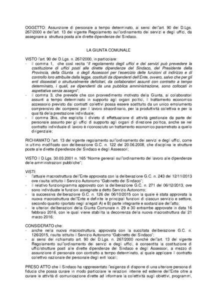 DELIBERAZIONE DELLA GIUNTA COMUNALE N. 33 DEL 23/02/2016 - Assunzione di personale a tempo determinato, ai sensi dell’art. 90 del D.Lgs. 267/2000 e dell’art. 13 del vigente Regolamento sull’ordinamento dei servizi e degli uffici, da assegnare a struttura posta alle dirette dipendenze del Sindaco.