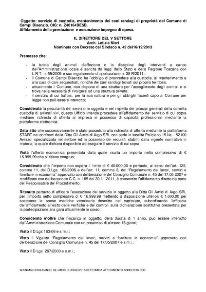Comune di Campi Bisenzio - DETERMINAZIONE N. 146 DEL 2016-03-15 - Servizio di custodia, mantenimento dei cani randagi di proprieta del Comune di Campi Bisenzio. CIG: n. Z48184BE5B. Affidamento della prestazione e assunzione impegno di spesa.