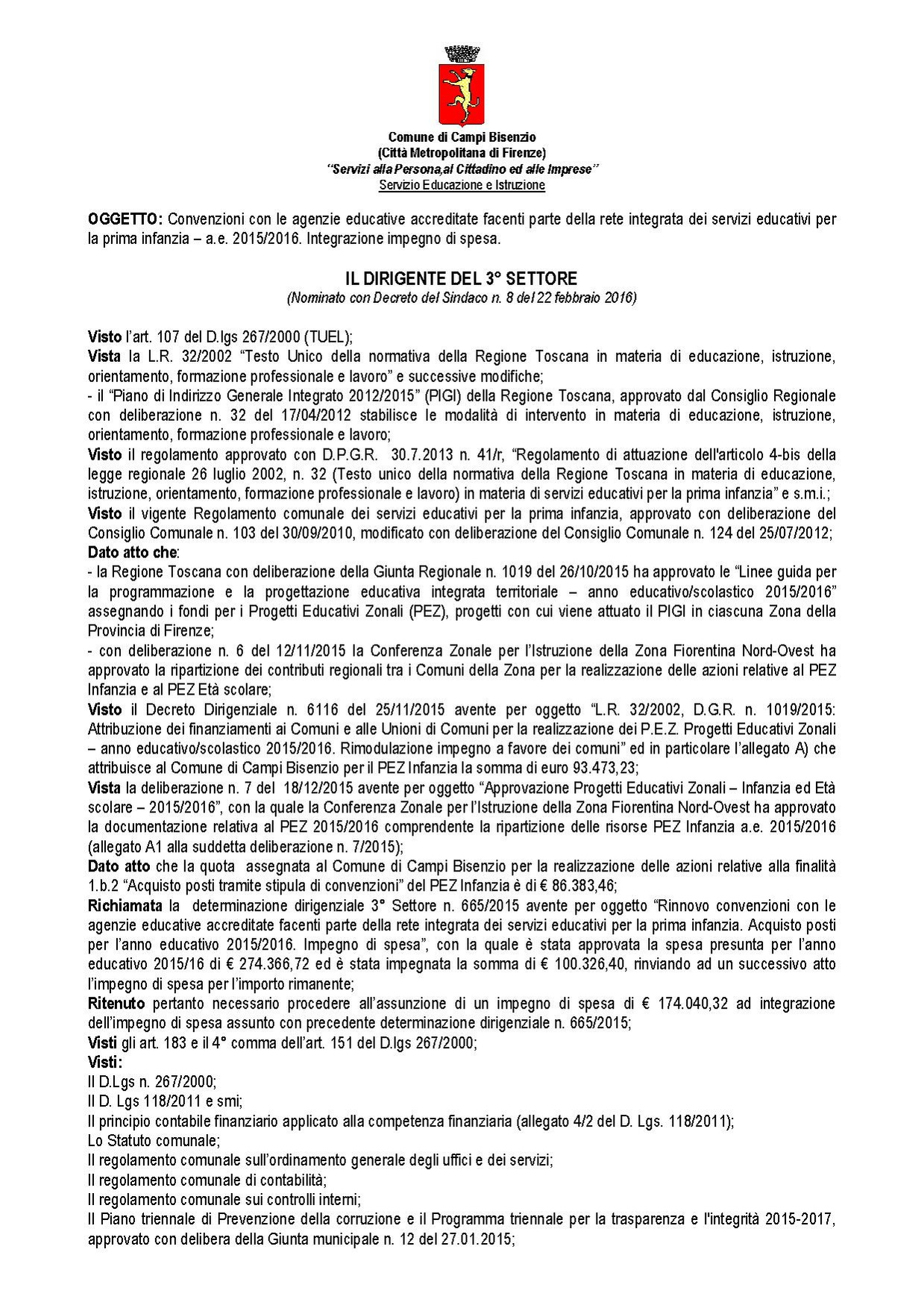 Comune di Campi Bisenzio - DETERMINAZIONE N. 168 DEL 2016-03-22 - Convenzioni con le agenzie educative accreditate facenti parte della rete integrata dei servizi educativi per la prima infanzia ? a.e. 2015/2016. Integrazione impegno di spesa.