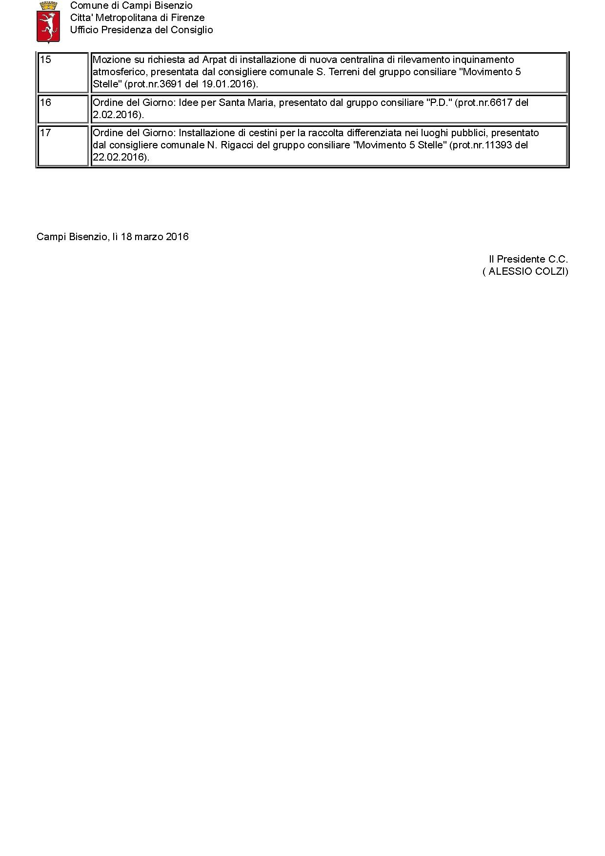 Convocazione in seduta ordinaria del CONSIGLIO COMUNALE per il giorno GIOVEDI' 24 MARZO 2016 alle ore 17:00 con eventuale prosecuzione serale - ORDINE DEL GIORNO