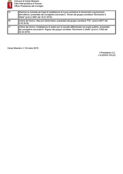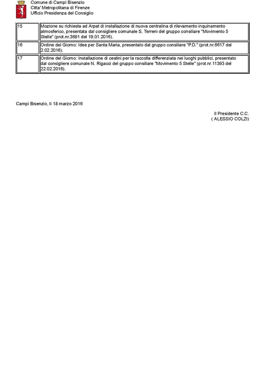 | attuale | 21:36, 29 set 2016 | 1 240 × 1 753, 2 pagine (57 KB) | Niccolo Rigacci (discussione | contributi) | Convocazione in seduta ordinaria del CONSIGLIO COMUNALE per il giorno GIOVEDI' 24 MARZO 2016 alle ore 17:00 con eventuale prosecuzione serale - ORDINE DEL GIORNO |