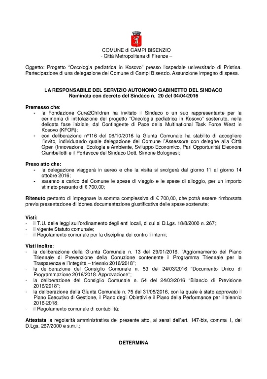 Comune di Campi Bisenzio - DETERMINAZIONE N. 720 DEL 2016-10-10 - Progetto ?Oncologia pediatrica in Kosovo? presso l'ospedale universitario di Pristina. Partecipazione di una delegazione del Comune di Campi Bisenzio. Assunzione impegno di spesa.
