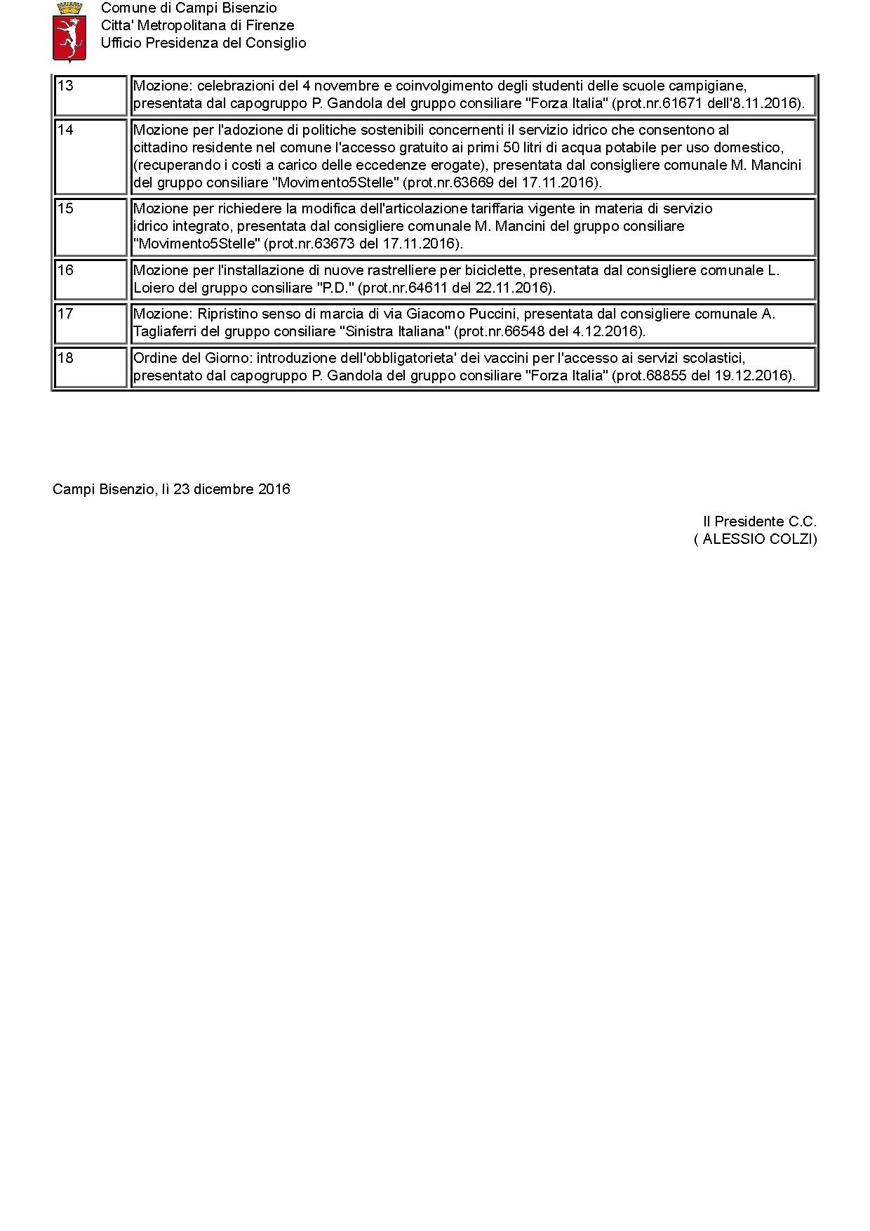 | attuale | 10:10, 4 gen 2017 | 1 240 × 1 753, 2 pagine (59 KB) | Niccolo Rigacci (discussione | contributi) | Convocazione in seduta pubblica del CONSIGLIO COMUNALE per il giorno GIOVEDI' 29 DICEMBRE 2016 alle ore 17:00 - ORDINE DEL GIORNO |