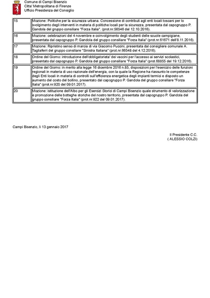 Comune di Campi Bisenzio - Convocazione in seduta pubblica del CONSIGLIO COMUNALE per il giorno GIOVEDI' 19 GENNAIO 2017 alle ore 17:00 con prosecuzione serale - ORDINE DEL GIORNO